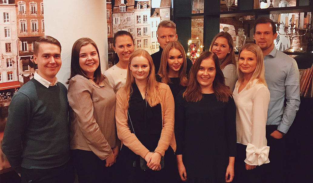 Styrelsen för året 2018 valdes på höstmötet 28.11.2017. Grattis till de invalda och ett hjärtligt tack till alla aktiva ansökare. Från vänster till höger på bilden: sekreterare Iiro Laitinen, chefredaktör Elina Uitto, allmänansvarig Erna Kalpala, utrikesansvarig Hilda Ahlgrén, prepkursansvarig Johannes Kukkonen, studieansvarig Sofi Lehtinen, ordförande Sofia Kinnunen, kulturansvarig Laura Maessen, ekonomiansvarig Elina Sorjonen, exkursionsansvarig Markus Petman.
